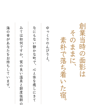 日々の喧騒から離れ、のんびりと心ほどけるひとときを、ぜひ当宿でお過ごしいただければ幸いです。